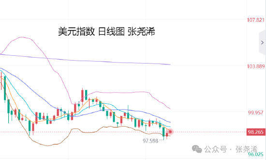 美元指数,日图早间高开先行走强,对金价多头造成限制,使其高开回撤,但整体走势仍运行在布林带中轨及短期均线下方,且布林带仍偏向下延伸,空头占据优势,也暗示后市偏向看空走低,而会支持金价再度走强,周图走势处于5-10周的均线压力下,月图也更是保持的回落趋势和前景,也暗示后市偏向走低下行,故此,对于金价来说,仍具看涨前景。
