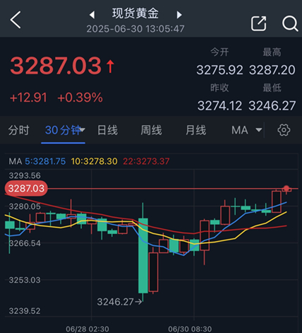 北京时间13:05,现货黄金报3287.03美元/盎司。