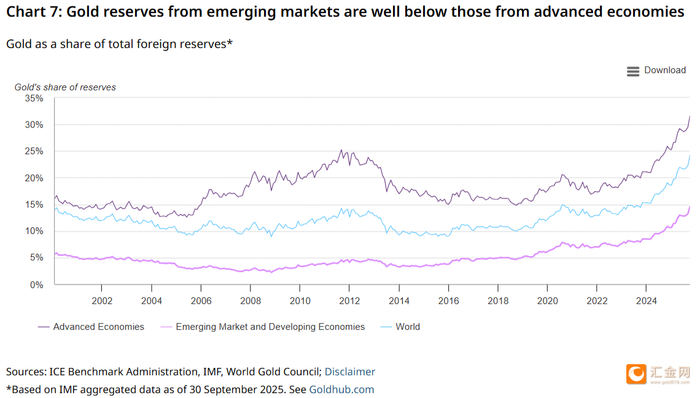 分析师指出:“新兴市场国家的黄金储备(这是需求的主要来源)仍远低于发达国家水平。如果地缘政治紧张局势升级,新兴市场的购金步伐可能加快,从而强化对黄金的结构性支撑。”
