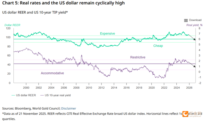 他们进一步指出:“利率下行与美元走弱(两者目前均处于周期性高位)的结合历来是黄金的支撑因素。此外,即使经济环境保持相对温和,央行持续的战略性购金以及中国保险公司或印度养老基金等潜在新投资机构的入场,都可能进一步巩固黄金的积极趋势。”