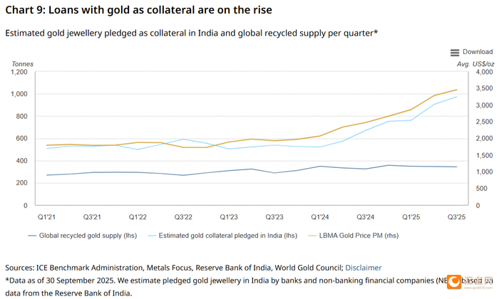 回收金流也可能成为影响黄金价格方向的重要摇摆因素。分析师表示:“在计入金价上涨及经济增长影响等因素后,今年黄金回收量相对低迷。这一现象与黄金作为贷款抵押品的使用显著增加有关。仅今年一年,印度消费者通过正规渠道抵押的黄金首饰就超过200吨。非正式证据表明,非正规部门的黄金抵押贷款规模也几乎相当。”