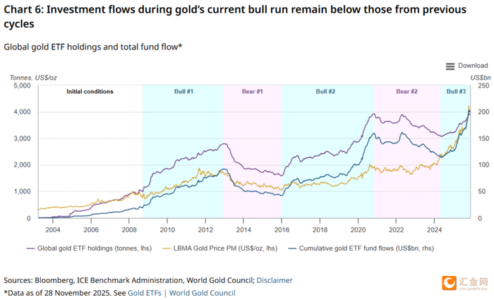 世界黄金协会称,黄金ETF的投资需求仍将是关键驱动力,很可能抵消珠宝或科技领域可能出现的疲软。他们指出:“历史表明,价格上涨往往会激发投资者兴趣,加速动量形成。今年以来全球黄金ETF已录得770亿美元资金流入,持仓量增加逾700吨。即使我们将观察起点进一步回溯至2024年5月,全球黄金ETF总持仓量仍增长约850吨。这一数字尚不及此前黄金牛市周期所见规模的一半,表明仍有充足的增持空间。”