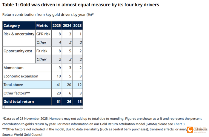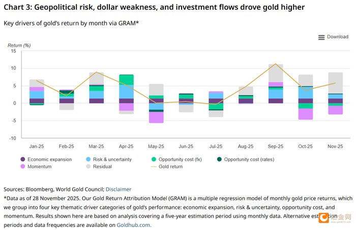世界黄金协会的黄金归因模型显示,高风险环境(主要由地缘政治风险驱动)解释了金价年内涨幅中约12个百分点的来源,而美元走弱和利率小幅下降带来的机会成本降低则贡献了另外10个百分点。