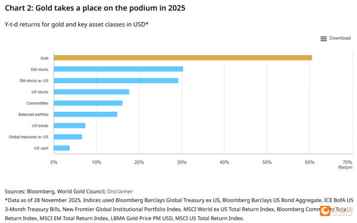 世界黄金协会分析师在《2026年黄金展望》报告中指出,2025年黄金表现亮眼,创下50多次历史新高,涨幅超过60%。他们表示:“地缘政治和经济不确定性加剧、美元走弱以及积极的价格势头共同支撑了这一表现。投资者和央行都增加了黄金配置,以寻求多元化和稳定性。”