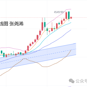 周线级别,金价上周遇阻回落转跌,相对于前周形成阴包阳看空回落的预期,暗示后市将有继续走低触及10周均线4230美元乃至中轨及30周均线支撑位置4000美元关口附近或下方的预期,但由于走势趋势向上,均线多头排列,故此,如有进一步调整触及各均线支撑目标,也是先行入场看涨的机会。