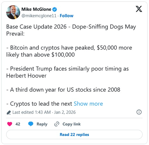 与金融界其他一些知名人士——尤其是罗伯特·清崎(Robert Kiyosaki)——的观点相呼应,麦格隆在1月1日表示,2026年将是一个充满波动与危机的年份,但同时也蕴藏机会;对那些“擅长战术操作”的人来说,甚至可能赚到一大笔钱。