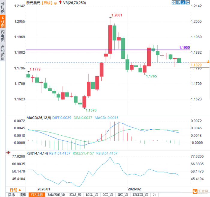 从技术面审视,欧元兑美元的短期前景依然不容乐观。日线图上,价格在触及1.2081高点后便一路下行,不仅跌破了1.1900的重要支撑,更在1.1830附近徘徊不前。MACD指标柱状图深陷零轴下方,DIFF与DEA死叉向下,明确显示空方动能仍占据主导。虽然RSI指标位于50中轴略上方,显示市场尚未进入极端超卖区,但也意味着缺乏强劲的反弹驱动力。分析认为,若欧元无法迅速夺回1.1900失地,下行空间将被进一步打开,下方1.1765一线将成为多头最后的防线。一旦该位置失守,更深级别的回调恐将开启。