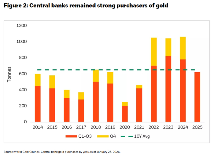 她进一步指出,来自央行、加密货币领域以及AI基础设施建设的新需求浪潮,可能仍处于早期阶段,尽管2025年那样的大幅上涨通常不会频繁重演。
