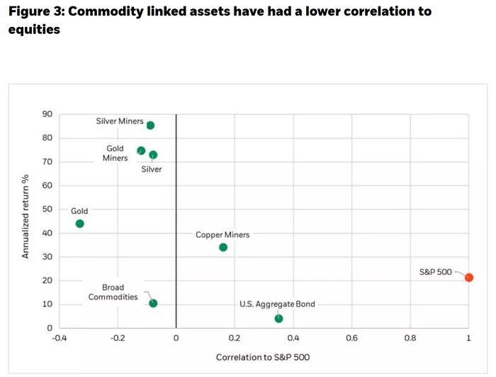 她写道:“政策转换期和全球格局重组时期,往往会提升市场对避险资产的需求。但我们并不只是将贵金属视为避险工具,而更倾向于把它们理解为投资组合中的稳定器。历史上,在市场承压阶段,贵金属与股票往往呈现低相关甚至负相关。”