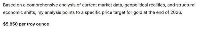 同样,该AI还分析了贵金属的价格动能,并指出在突破5000美元/盎司并维持在该水平之上后,6000美元/盎司如今成为黄金的“引力中心”。