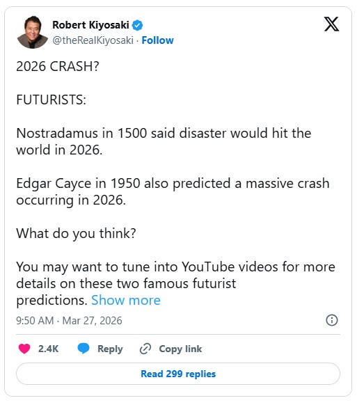 在3月26日的一条X帖子中,畅销个人理财书《富爸爸穷爸爸》的著名作者罗伯特·清崎(Robert Kiyosaki)在预测下一次金融危机何时到来时,使用了一个常见的修辞手法。