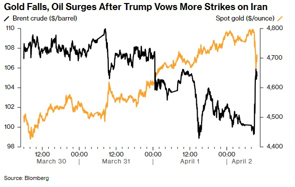 周四(4月2日)亚市盘中,在美国总统特朗普(Donald Trump)发表了一场备受期待的讲话后,黄金价格出现暴跌。美国彭博社称,特朗普最新讲话未能就中东战争的解决提供明确方向。