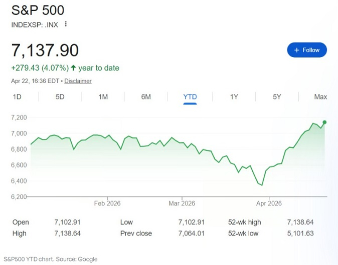 知名财经网站Finbold周四(4月23日)报道称,截至目前,2026年在多个资产和资产类别中都表现出较大的波动性:既出现了大幅回调,也伴随着严重的衰退担忧,但与此同时,像标普500这样的基准指数却连续创下历史新高。