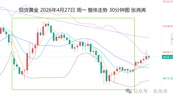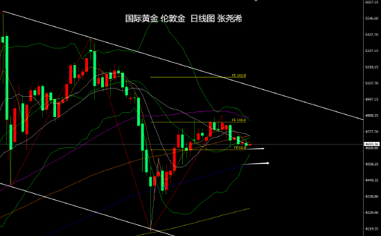4月28日:上交易日周一(4月27日):国际黄金震荡收跌,美伊海峡的博弈问题持续,令金价维持调整状态,并继续运行在100日均线及中轨线下方,空头仍占据优势,暗示短期仍有望回撤至4550美元或更低位置的预期。