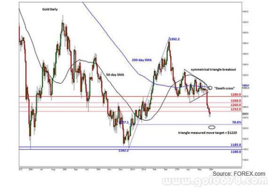 分析师:“死亡交叉”暗示黄金恐进一步深跌至1220美元