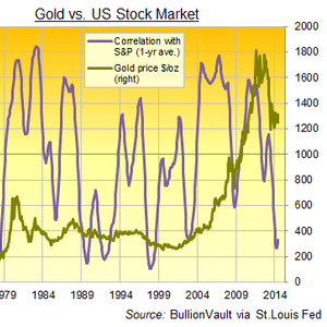 然而事实上,虽然自1969年起,金价和美联储的利率在47%的时候是相反的走势,如果将通胀计算在内,那么就是54%的时候是相反走势,但这并不能就此来对金价走势进行预测。而金价和美国股市之间的关系则有大约48%的时候是相反的。