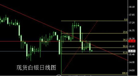 白银大跌后接近近期回落的低点15.5美元附近,该位不破尚有短线整理的可能,跌破则全面看空,反弹阻力16美元附近。