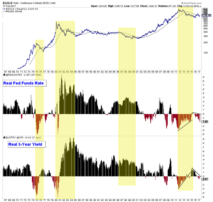 (黄金和联邦基金真实利率以及5年真实利率的走势图)