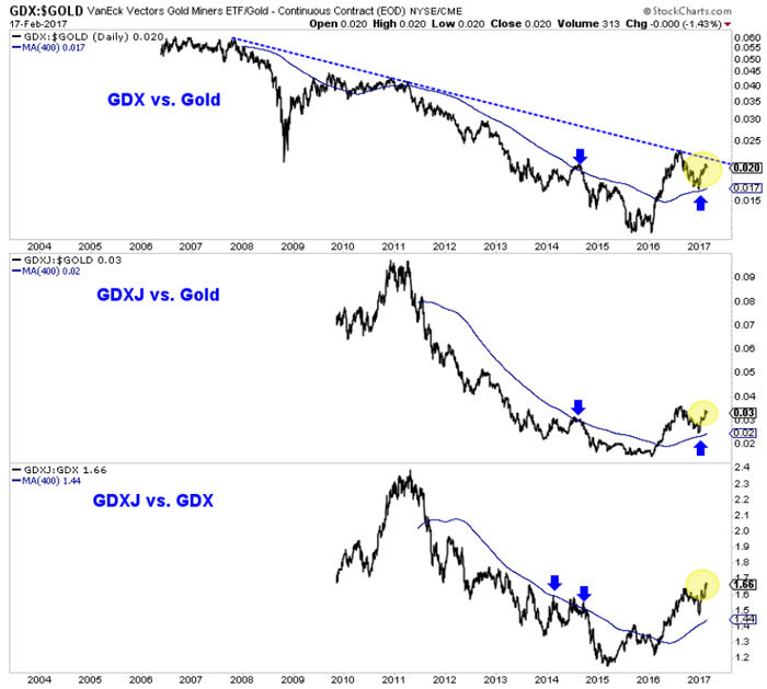 在黄金牛市期间,黄金股的表现应该要强于黄金的表现。从上图可以很明显看出,GDX和黄金的比率正在尝试突破10年来的下降趋势线,并且GDXJ和GDX的比率已经到达4年的高点。