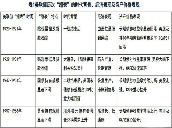 从1920年开始,将近一百年的时间,美联储缩表共计达到6次。分别是1920——1921年(一战后)、1929——1931年(美国大萧条)、1947-1951年(二战后)、1957-1965年(布雷顿森林体系)、1978-1979年(石油危机时期)、2000-2001年(科网泡沫破灭时期)。