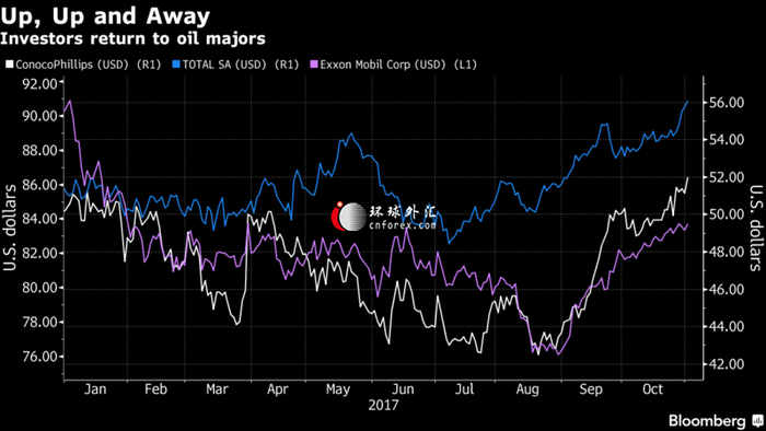在油价上涨的同时,能源股的表现也反映出了市场的乐观情绪,投资者押注主要产油国将继续致力于减产努力。数据显示,尽管第三季度业绩平平,但能源价格的光明前景仍推动了埃克森美孚公司(Exxon Mobil corp)股价上涨。而康菲石油公司(ConocoPhillips)在公布了好于预期的业绩报表后正处于近一年来最高位。在欧洲,英国石油公司(BP Plc)和道达尔(Total SA)的股价也均来到了数月高点。