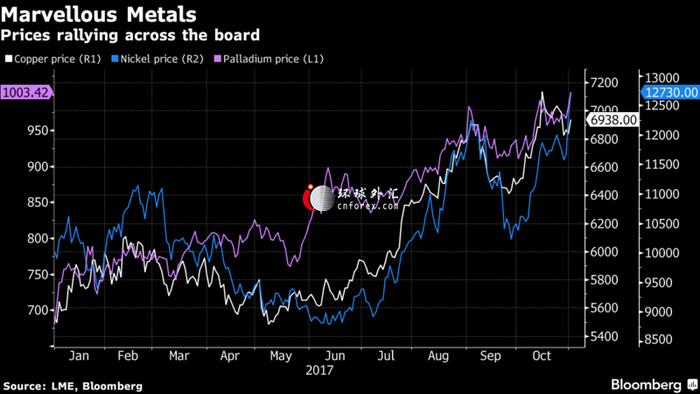 金属价格也在上涨,本周一年一度的LME Week正式召开,而这并未影响到金属价格的大涨步伐,从铝到锌,几乎一切金属市场都全面飘红。过去两天,LME期镍盘中累涨超10%,为五年来最大双日涨幅。受新能源车的电池需求提振,基本金属镍有望成为年终前价格涨势最亮眼的黑马。