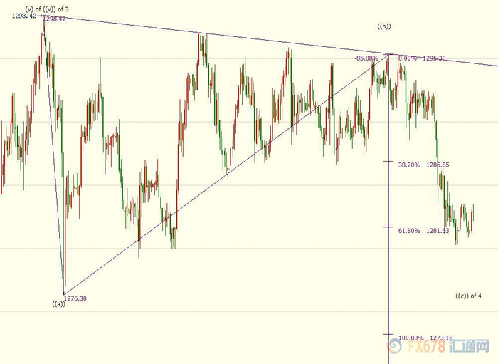 现货黄金先前自1276美元开启的反弹((b))浪似乎出现了延展,终点移至了1295美元附近,即下行((c))浪也从该价位开启,它们都是自1298美元开启的下行4浪的子浪。