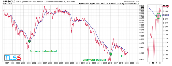 事实上,上述的现象不仅仅出现在金甲虫指数与新兴市场ETF(EEM)的对比中,金甲虫指标与标普500ETF(SPY)乃至金价间的比值,也同样如此。