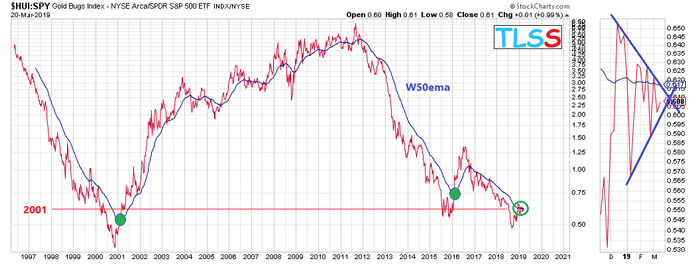 先来看金甲虫指数与新兴市场ETF(EEM)的对比,两者的比值目前升破了50周移动均线,这是自2001年和2016年以来,该比值首度在低位突破该均线。而众所周知,那两次经历均令黄金开启了牛市行情的序幕,尤其是2001年的那次,黄金价格更是走出了十年长牛。