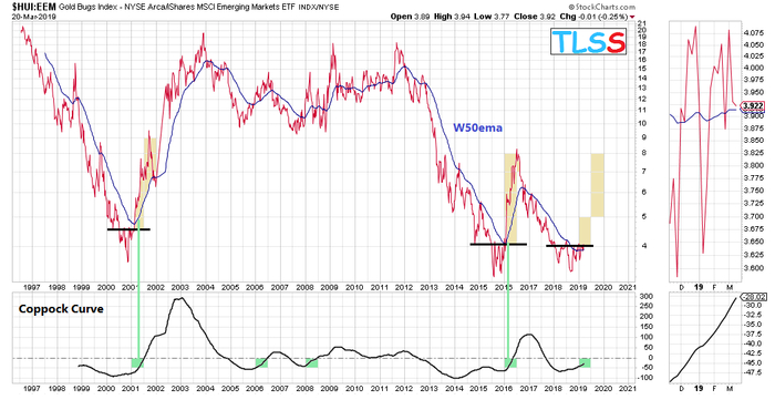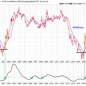 除了逾越关键移动均线外,金甲虫指数与新兴市场ETF比值间的估波指标(Coppock Curve)也正释放出利多信号。这一指标熟悉的投资者可能不多,但其实在中长期行情中对于研判牛市是否到来颇为可靠。