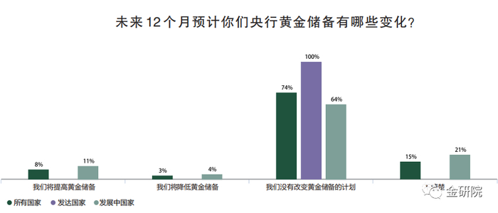 调研显示,未来还会有更多的黄金买盘。11%的新兴和发展中国家央行表示,他们打算在未来12个月内购买更多黄金。世界上大约有186家央行,其中的155家央行来自新兴和发展中国家。所以如果我们假设这是一个具有代表性的样本,那么预计未来12个月内将有17家(新兴和发展中国家)央行加大黄金购买量。这与去年19家央行购买(超过一吨)黄金的情况基本一致。