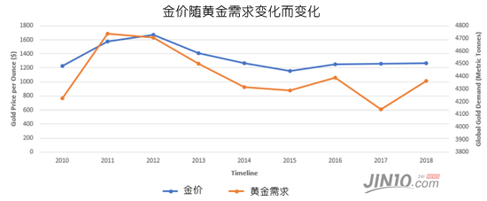 黄金需求有三个主要来源,分别为珠宝、工业和医疗应用以及投资。过去8-10年的数据表明,黄金价格走势基本与金属需求呈正相关关系。