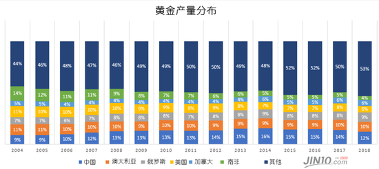 2008年金融危机之后,中国抓住机遇并稳步增加其产量,中国在全球黄金产量中的份额在2016年从约10%增加到超过15%。不过过去两年中国黄金产量有所下降,秘鲁等国家的产量份额上升。
