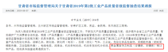 新浪财经讯 8月14日,近日,甘肃省市场监督管理局发布《甘肃省市场监督管理局关于甘肃省2019年第2批工业产品质量省级监督抽查结果通报》,抽查了45家经销企业的50 批次贵金属首饰及制品。
