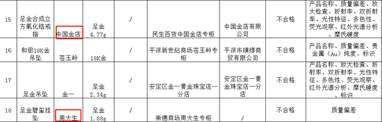 结果表明,抽查样品中合格27批次,14批次产品名称或标识不规范,不合格9批次,产品质量抽查合格率82%。不合格9批次产品中,主要是质量偏差、贵金属纯度项目不符合标准要求。值得注意的是,周大生、中国黄金、中国珠宝、中国金店等知名品牌上榜。