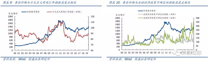 黄金与日元、瑞郎、发达经济体国债等普遍被认为是全球无风险资产,黄金之所以具有避险属性,主要有两点原因:一是黄金作为非主权“货币”不存在信用风险,且天然的稀缺性保证了其价值的内在稳定;二是黄金与美债收益率高度负相关,避险情绪驱动美债收益率下行同样也利好黄金。数据显示,在全球经济政策不确定性指数持续上升期间,黄金价格往往趋于上涨,因此,判断黄金走势的第三个核心变量是全球不确定性,全球不确定性增加则黄金趋于上涨。