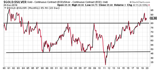 2018年底,金银比升至80以上,此后一直高于这一水平。假设我们在2020年再次看到这种模式,即金银比降至45,而金价没有变动,那么银价甚至可能会飙升至33美元。