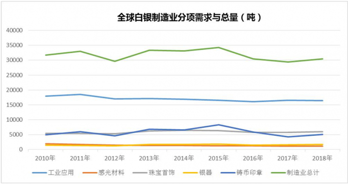 :全球的白银实物消费主要来自工业制造领域、摄影业、珠宝首饰、银器等。传统白银消费领域摄影业逐步被数码技术所取代,对白银的需求呈下降趋势。银币造币的需求在2015年一度高企,后续出现下降,2018年因白银成本下降出现一定的铸币印章消费的提升。工业需求占据白银消费中一半以上的份额,受经济波动周期影响较大,近几年总体呈现一定的下降,2017年稍微好转,2018年又略微下降。珠宝首饰业对白银的消费总体近年呈现下降态势,2016年后趋于平稳。总体上,全球白银的消费需求总量维持在3万吨至3.5万吨之间,2018年的总体需求稍微好转趋升,但是贡献并未出现在主要的工业应用领域。