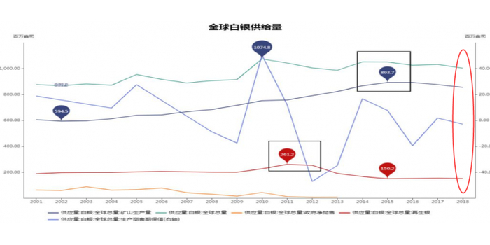 全球矿产银生产主要集中在白银资源相对丰富的国家和地区,而再生银生产主要集中在一些白银消费大国。2018年全球矿山白银生产855.70百万盎司(24258.7 吨),自2015-2016年以后,全球矿山生产的白银出现了明显的下降拐点。再生白银则更早在2011年达到261.2百万盎司(7404.9吨)后也出现了下降。总体来看,全球白银的供给总量在2010年和2014年出现了总量上的分水岭。