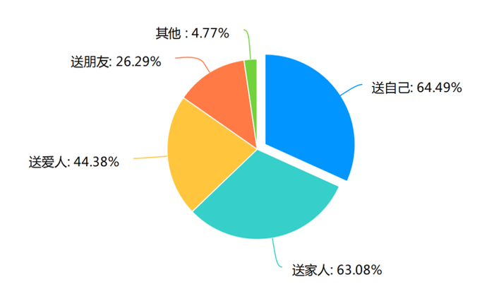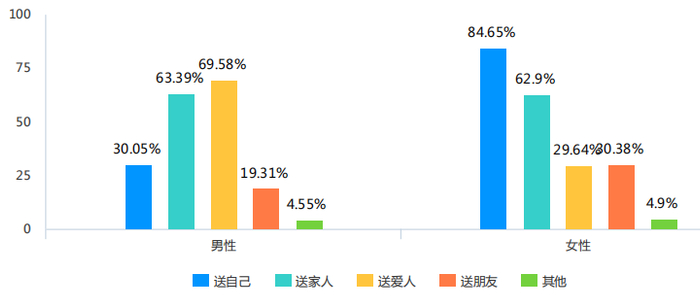 有 64.49% 的受访者会为自己选购珠宝首饰,而在女性消费者中这一比例更是达到了84.65%。与犒赏自己比例几乎持平的是馈赠家人,为 63.08%。数据显示,男性比女性更愿意送对方珠宝首饰,有 69.58% 的男性会选择送黄金珠宝给爱人,而愿意这么做的女性为29.64%。