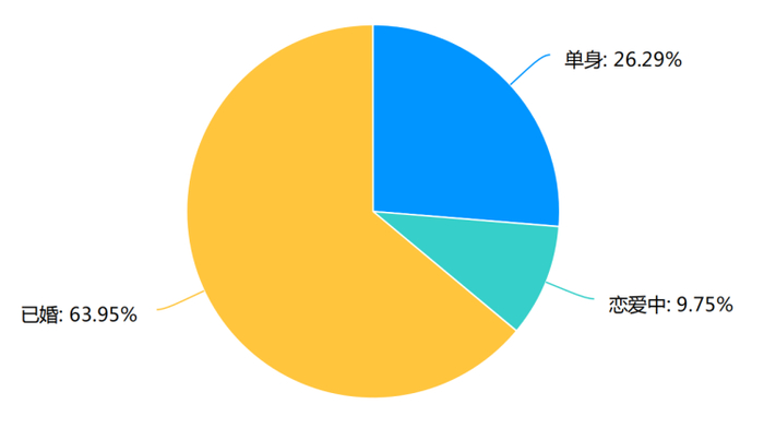 本次调查对象已婚人士所占比例最高,为 63.95%,超过半数。单身的为26.29%,恋爱中的为9.75%。