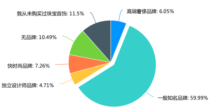 在本次调查中,88.5% 的受访者曾经有过珠宝首饰方面的消费,从未购买过珠宝首饰的受访者仅占11.5%。购买过一般知名品牌珠宝产品的受访者所占比例最大,为总数的59.99%,其次是无品牌的珠宝产品,占10.49%,而独立设计师品牌最为小众,仅4.71%的人曾经购买过。