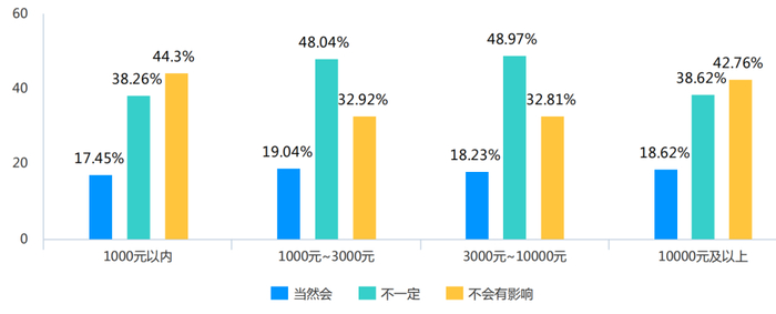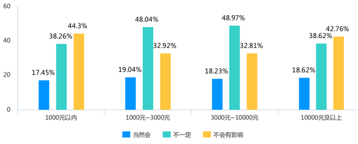 疫情对1000 元以内预算和10000元以上预算的订单影响较小,中间价位产品或面临销售困境。对于几千元价位的珠宝首饰,近半数的消费者持观望态度,疫情导致的经济损失使他们在考量此类非必需消费品时更为谨慎,珠宝企业可多推出客单价较低的小件首饰。
