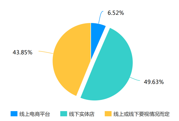 疫情结束后,对于黄金珠宝类产品的日常购买,线下实体店仍是多数消费者的选择,依然是黄金珠宝消费主战场。倾向线 上电商平台进行此类消费的仅有6.52%,占比不到一成。半数 (49.63%)左右消费者会继续选择线下实体店来选购此类产品, 同时也有 43.85% 的消费者表示要视情况而定,这部分消费者应是珠宝零售企业新零售转型升级的主要研究对象。