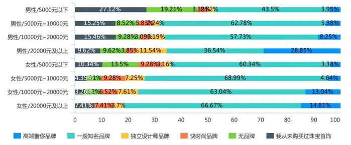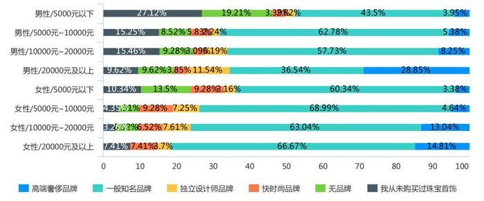 收入差别在选择不同品牌的珠宝首饰时影响不明显,总体来说,女性对珠宝首饰的购买需求比男性稍多,但差距不大。高收入男性比高收入女性更愿意消费高端奢侈品牌的珠宝。