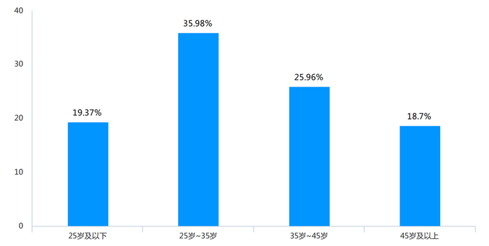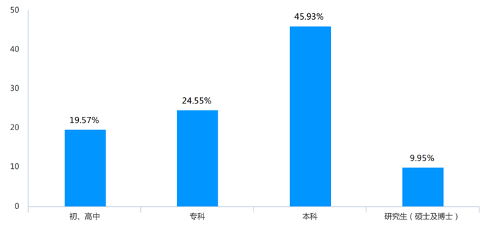 本次调查对象覆盖各年龄、学历和收入等级,同时以社会消费和生产主体人群为主。年龄上,主要集中在25~35 岁、35~45岁两个群体,整体占比为61.94%;学历上,专科及以上学历占比为 80.43%,其中大学本科及以上占比55.88%;收入水平上,平均月收入5000 元以下的占43.78%,5000元及以上的占56.22%。