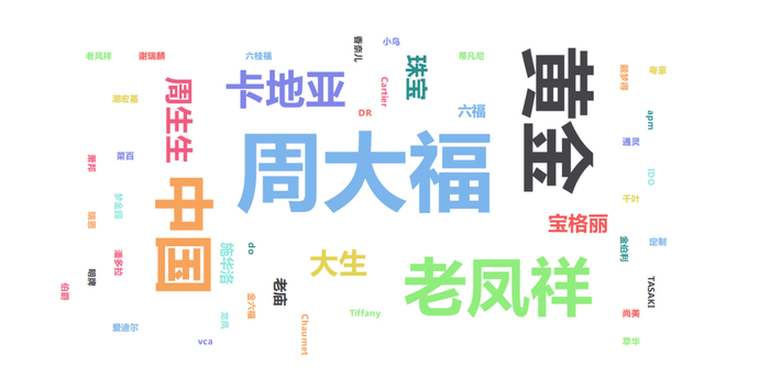 在本次调查中,消费者最喜爱的珠宝品牌出现词频最高的为周大福,共出现178次,紧随其后的是老凤祥132次,中国黄金120次,均为国内品牌。而在国际品牌方面,本次受访者最喜爱的国际品牌为卡地亚,共有93人次为其提名。