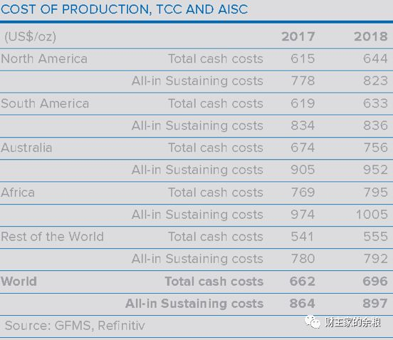 根据GFMS的划分,北美、南美、澳洲、非洲及世界其他区域的黄金2018年现金生产成本分别为644/633/756/795/555/792美元/盎司,其全维持成本则集中在800-1000美元/盎司,全世界平均起来的TCC和AISC分别为700美元和900美元。
