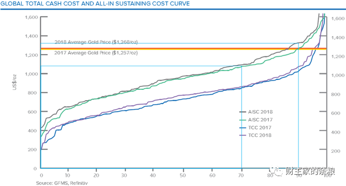 (图中纵轴为生产成本-美元/盎司,横轴为产能占比,红色和黄色横线分别为2018年和2017年的黄金平均价格,紫线和蓝线为2018年和2017年的TCC,灰线和绿线分别为2018年和2017年的AISC)。