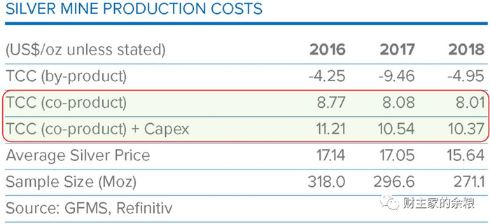 GFMS对于矿产白银生产成本统计并不区分区域,而是区分副产品(by-product)和主产品(co-product)的成本——在白银作为副产品而产出的时候,因为其现金成本费用已经全部摊销到其他主产品上(如铜、金、铅、锌等),所以其现金成本表现出来是负值,我们主要关心的,是白银作为主产品的生产成本。